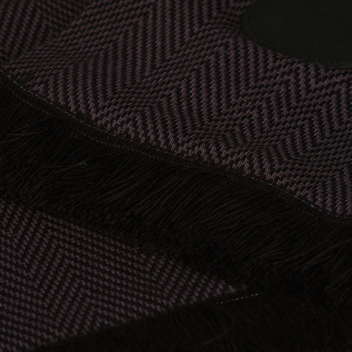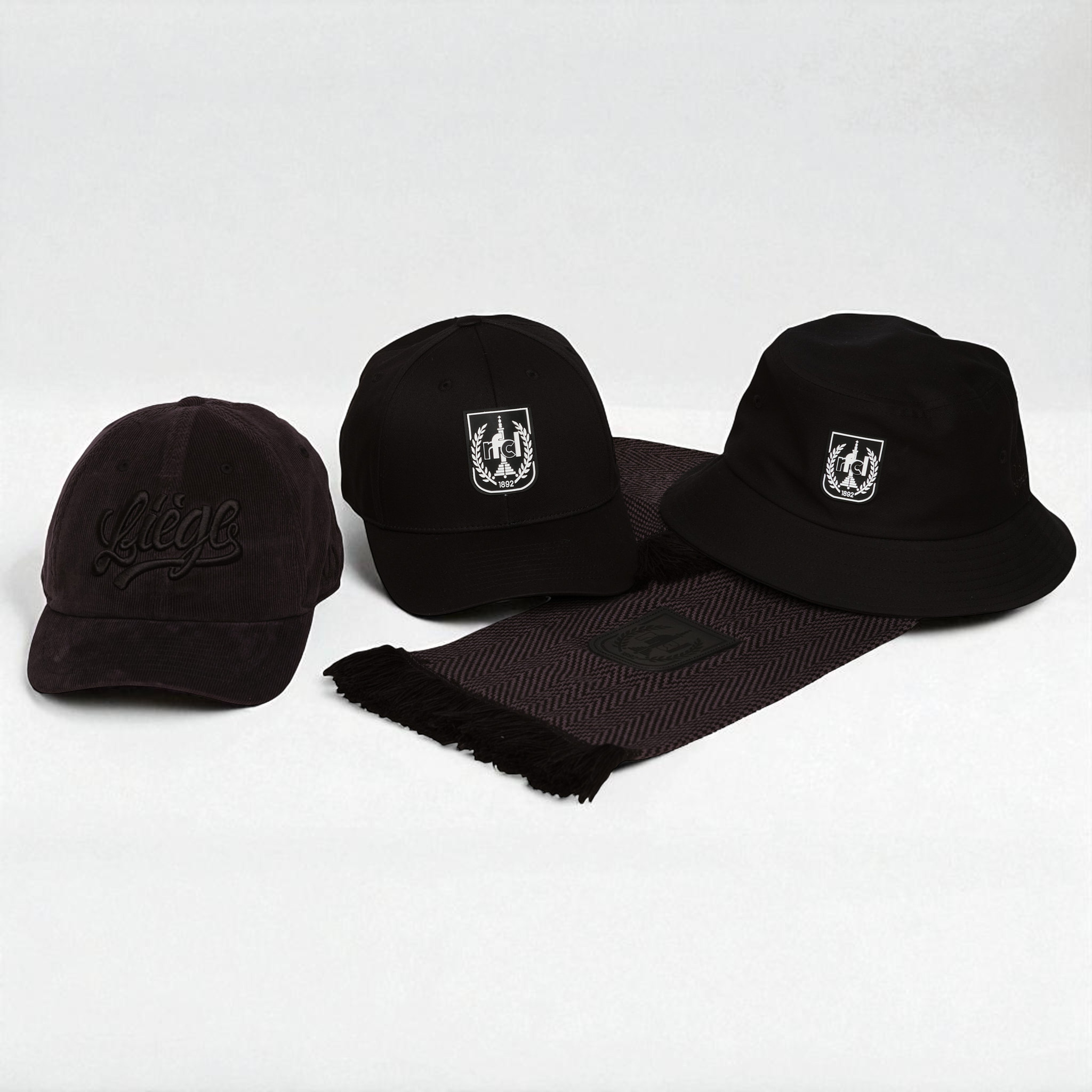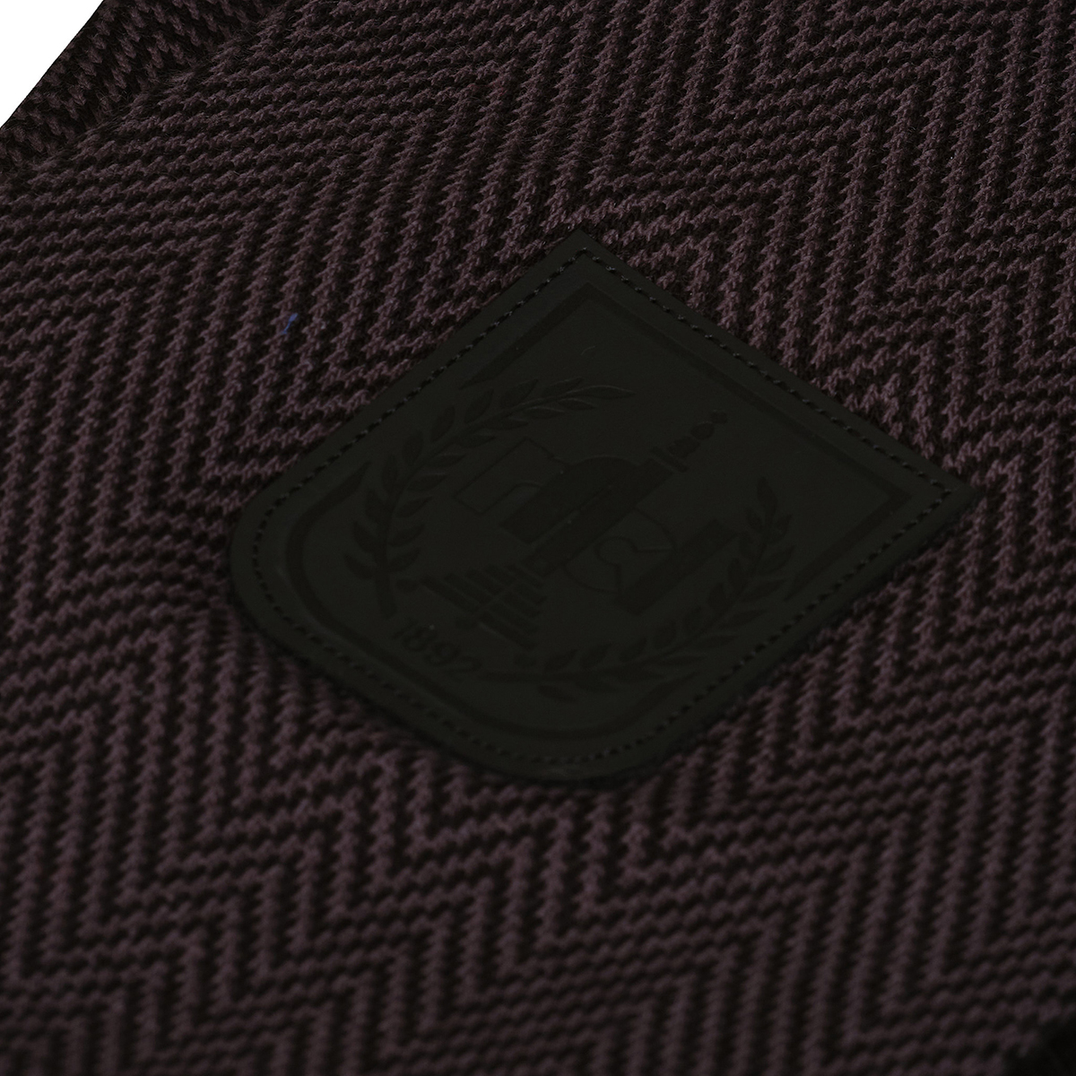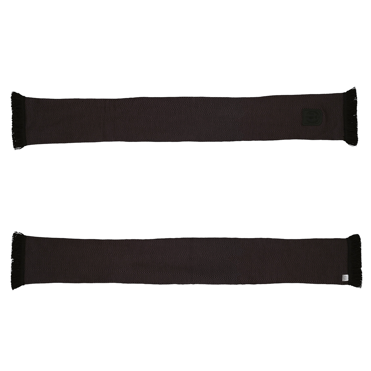L’écharpe noire vient compléter la collection avec une version sobre, tissée en noir et marquée par un patch cuir cousu avec le blason.